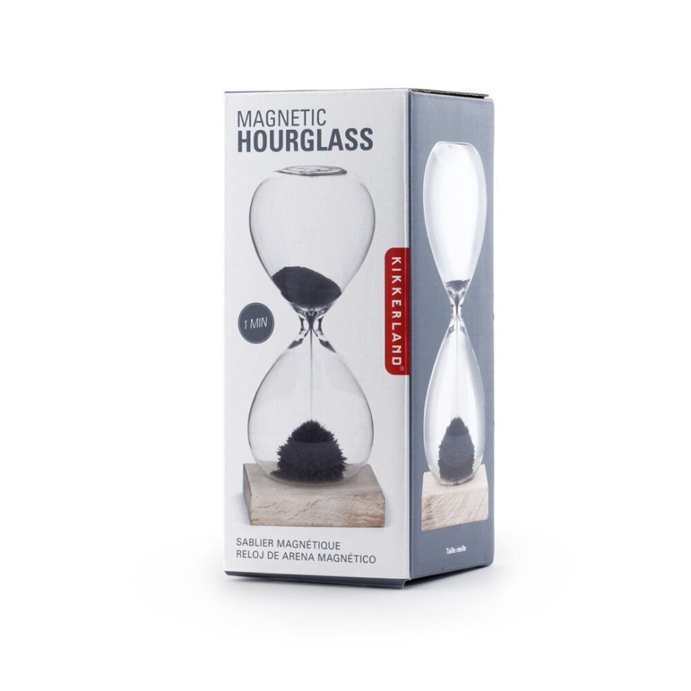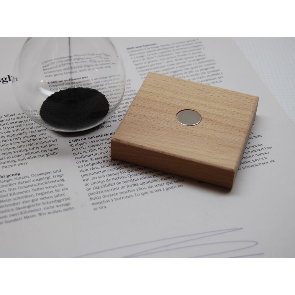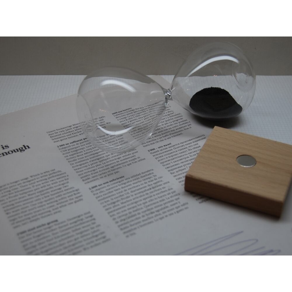 土台に強力なマグネットが埋め込まれており、砂時計を裏返すと、磁力に誘引されて砂鉄が不思議な形を生み出します。ナチュラルなビーチ材とガラスの組み合わせはインテリアにも合わせやすくお部屋のアクセントになるオブジェです。