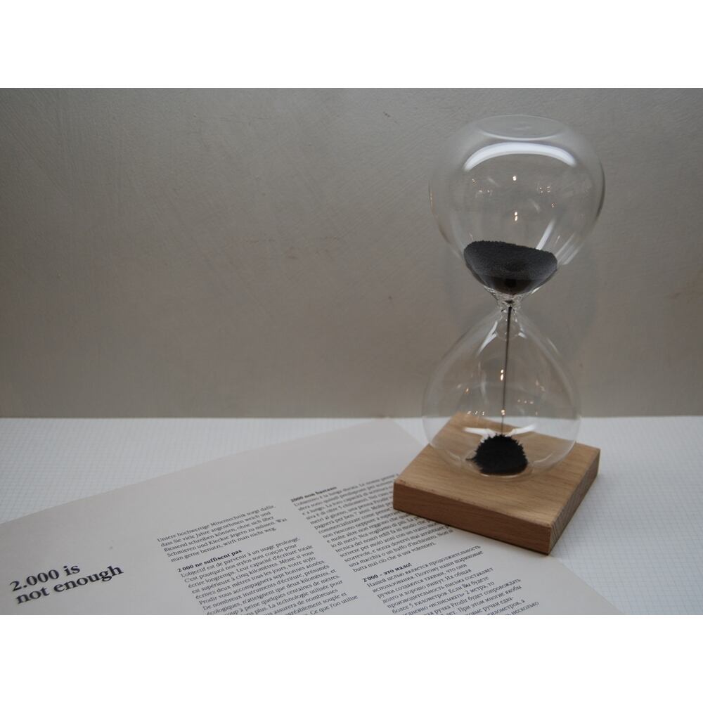 砂鉄を用いた砂時計。毎回違う不思議な砂の表情をガラスの中で楽しめます。